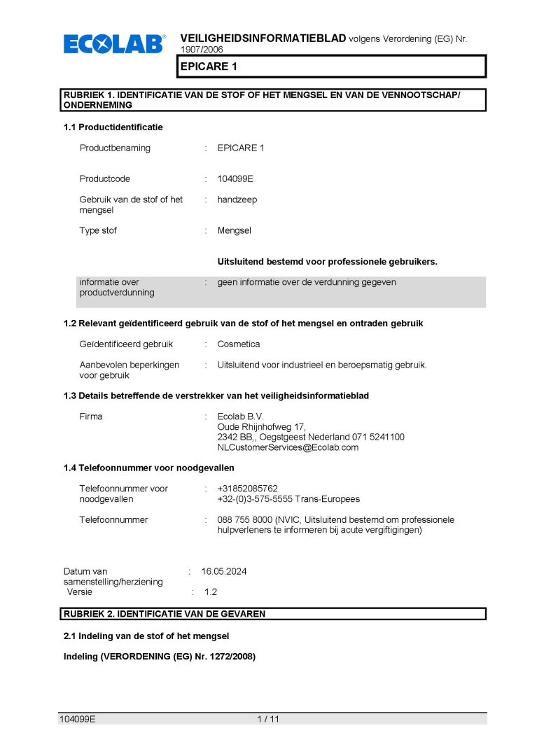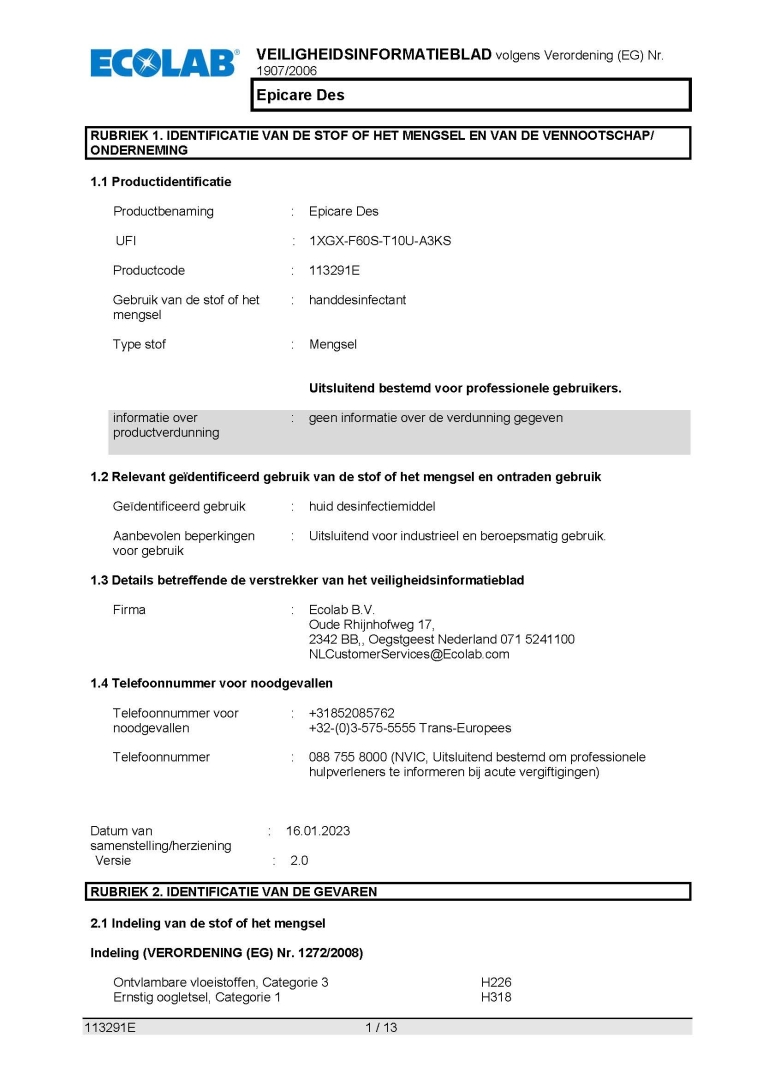 Veiligheidsinformatieblad ECOLAB EPICARE 1 12X500ML