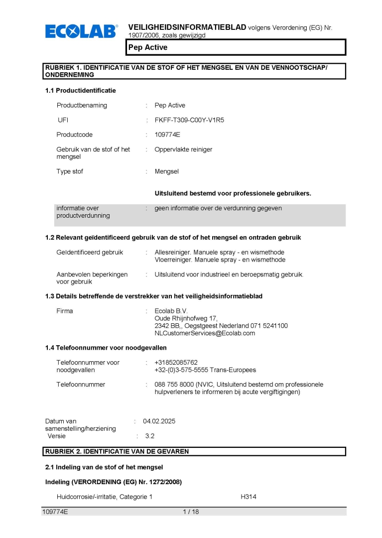 Veiligheidsinformatieblad ECOLAB PEP ACTIVE 6X500ML