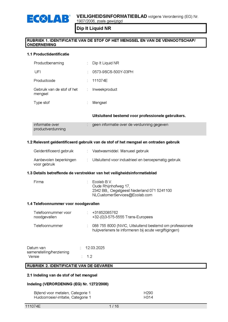 Veiligheidsinformatieblad ECOLAB DIP IT LIQUID NR 6X1L