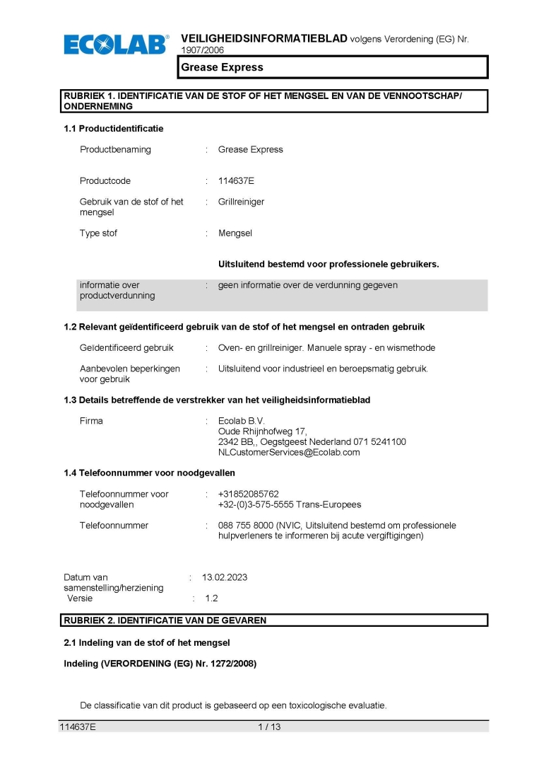 Veiligheidsinformatieblad ECOLAB GREASE EXPRESS 4X1L