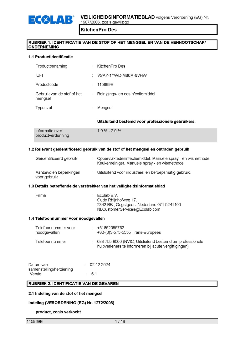 Veiligheidsinformatieblad ECOLAB KITCHENPRO DES 2X2L
