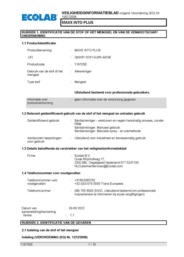 Veiligheidsinformatieblad ECOLAB MAXX INTO PLUS 6X1L
