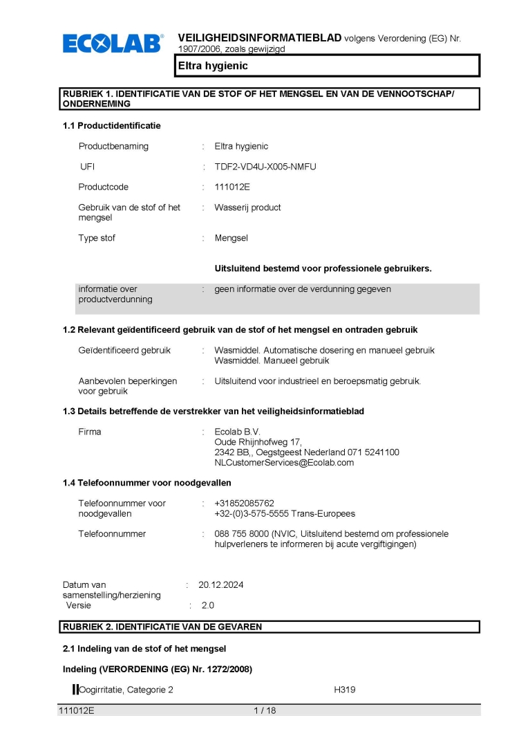 Veiligheidsinformatieblad ECOLAB TOTAALWASMIDDEL ELTRA HYGIENIC 20KG
