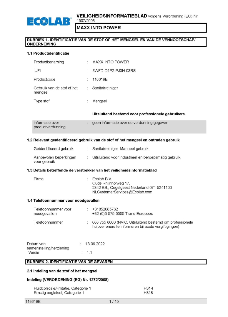 Veiligheidsinformatieblad ECOLAB SANITAIRREINIGER MAXX INTO POWER 1LTR