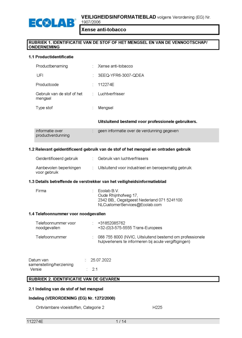 Veiligheidsinformatieblad ECOLAB XENSE ANTI-TOBACCO 750ML