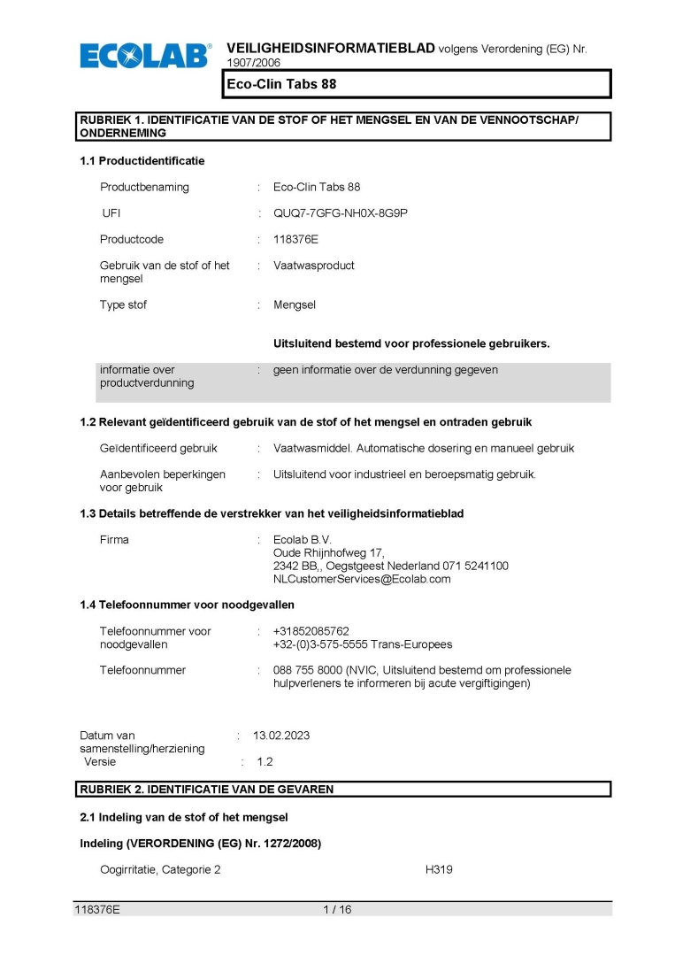 Veiligheidsinformatieblad ECOLAB VAATWASTABLETTEN ECO-CLIN SET Á 88 STUKS 4KG.