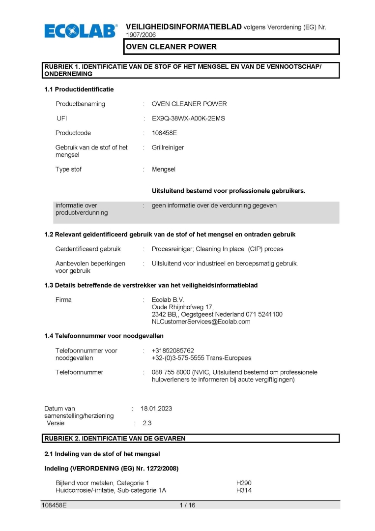 Veiligheidsinformatieblad ECOLAB OVENREINIGER OVEN CLEANER POWER 5LTR.