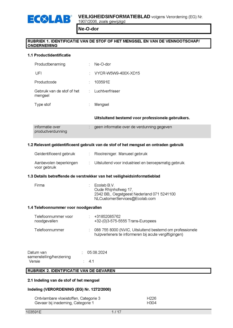 Veiligheidsinformatieblad ECOLAB ECOLOGISCH GEURNEUTRALISATOR NE-O-DOR 6X750ML