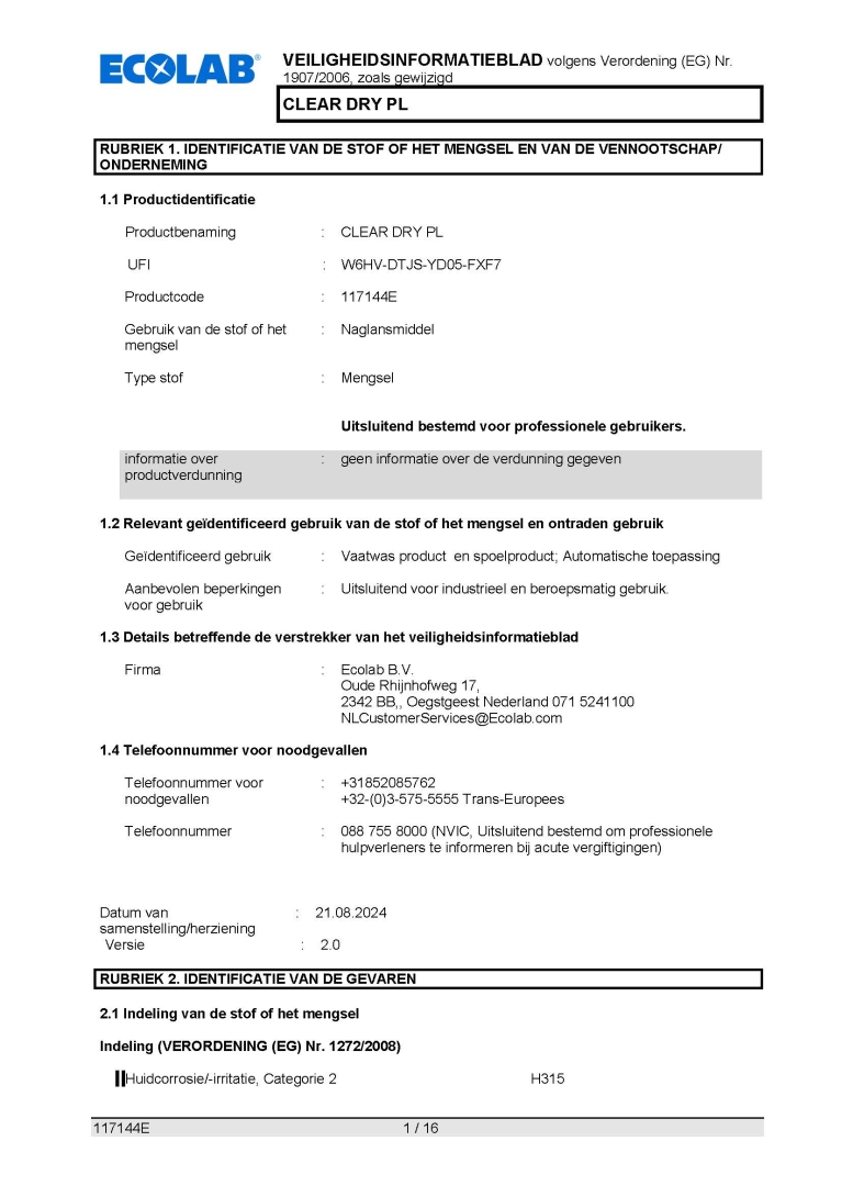 Veiligheidsinformatieblad ECOLAB NAGLANSMIDDEL CLEAR PL PLUS CLEAR DRY PL 2X5L