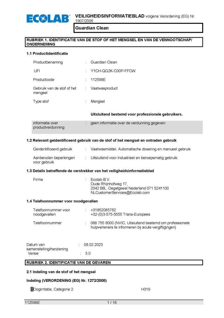 Veiligheidsinformatieblad ECOLAB ECOLOGISCH VAATWASTABLETTEN GUARDIAN CLEAN SET Á 200 STUKS 4KG.