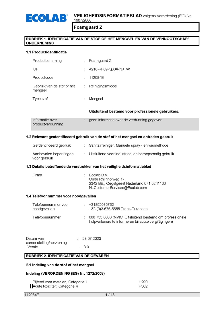 Veiligheidsinformatieblad ECOLAB ZURE SCHUIMREINIGER FOAMGUARD Z 5LTR.