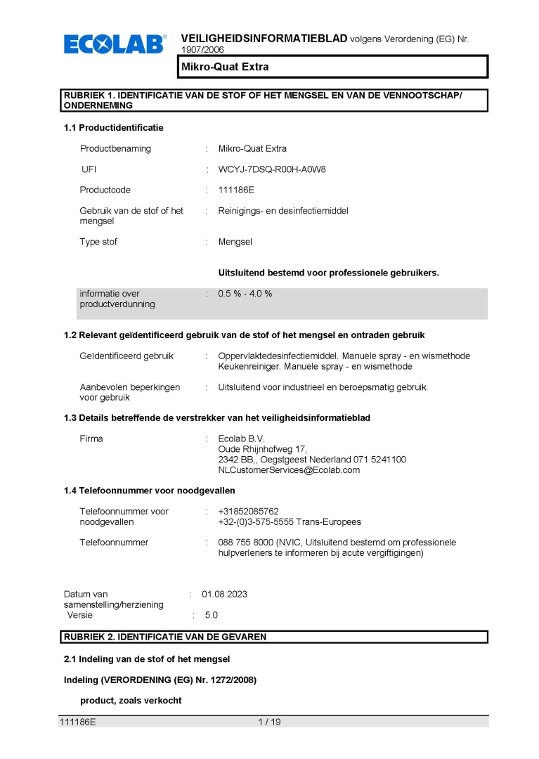 Veiligheidsinformatieblad ECOLAB Reinigingsmiddel Sprayfles Mikro-Quat Classic / Extra navulling 650 ml.