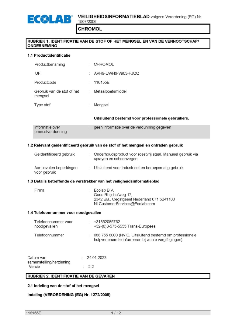 Veiligheidsinformatieblad ECOLAB Metaalpoetsmiddel Chromol 500ml.