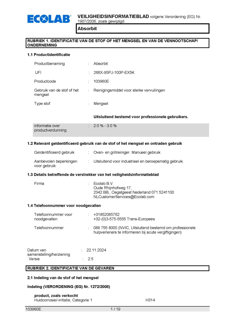 Veiligheidsinformatieblad ECOLAB Ontvetter Absorbit 2,2kg.
